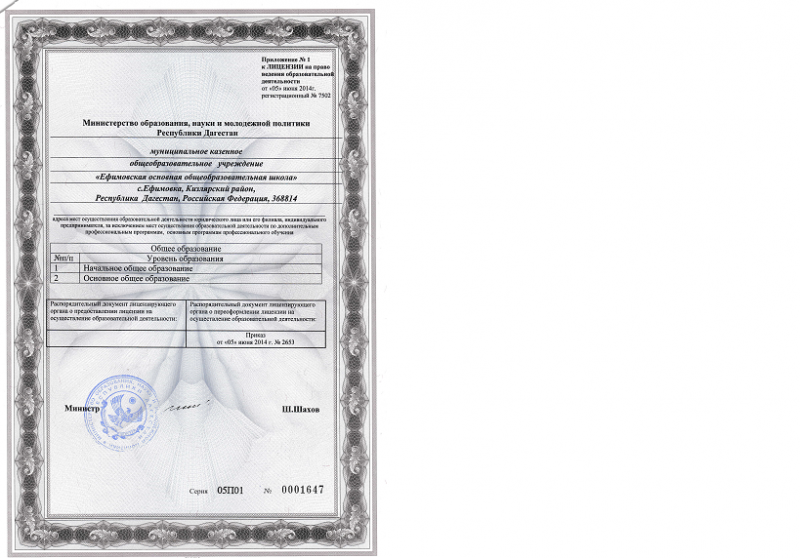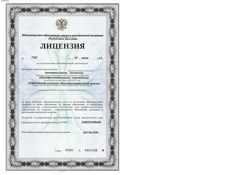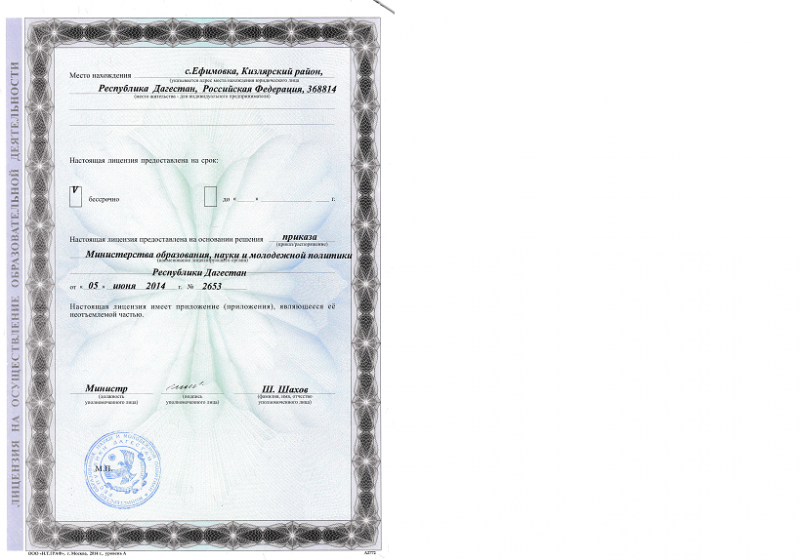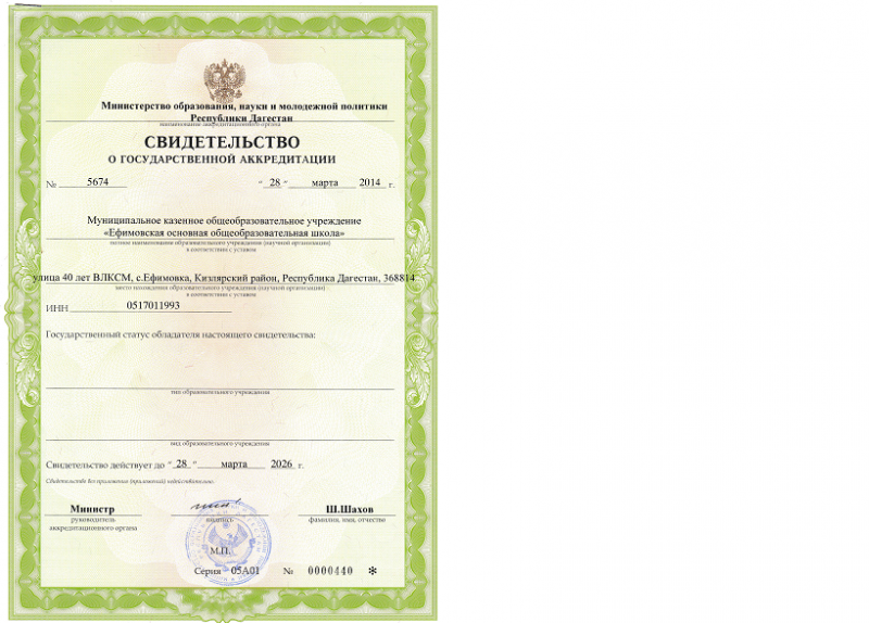 | Адрес местонахождения образовательной организации* | Республика Дагестан, Кизлярский район село Ефимовка улица 40 лет ВЛКСМ 368814 |